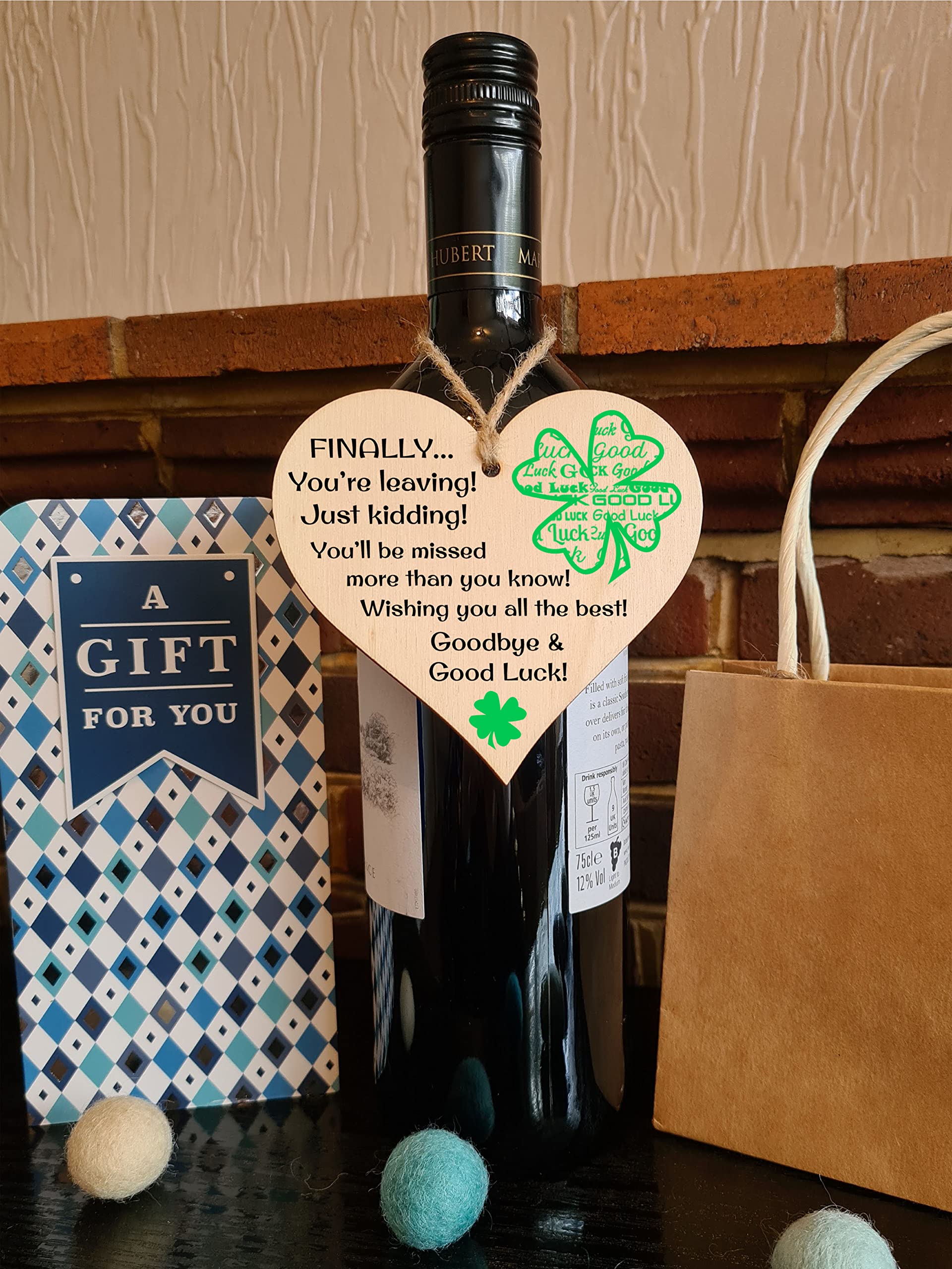 Beautiful handmade wooden heart shaped plaque. Shabby chic style hanging sign, with a unique printed design. Ideal gift for someone special. Made from high quality sustainable 3mm Plywood (Programme for the Endorsement of Forest Certification). Can be used as a hanging decoration, or even as a gift tag. Tag Reads Finally… Your'e Leaving!! Just kidding! You'll be missed more than you know. Wishing you all the best. Goodbye & Good Luck.