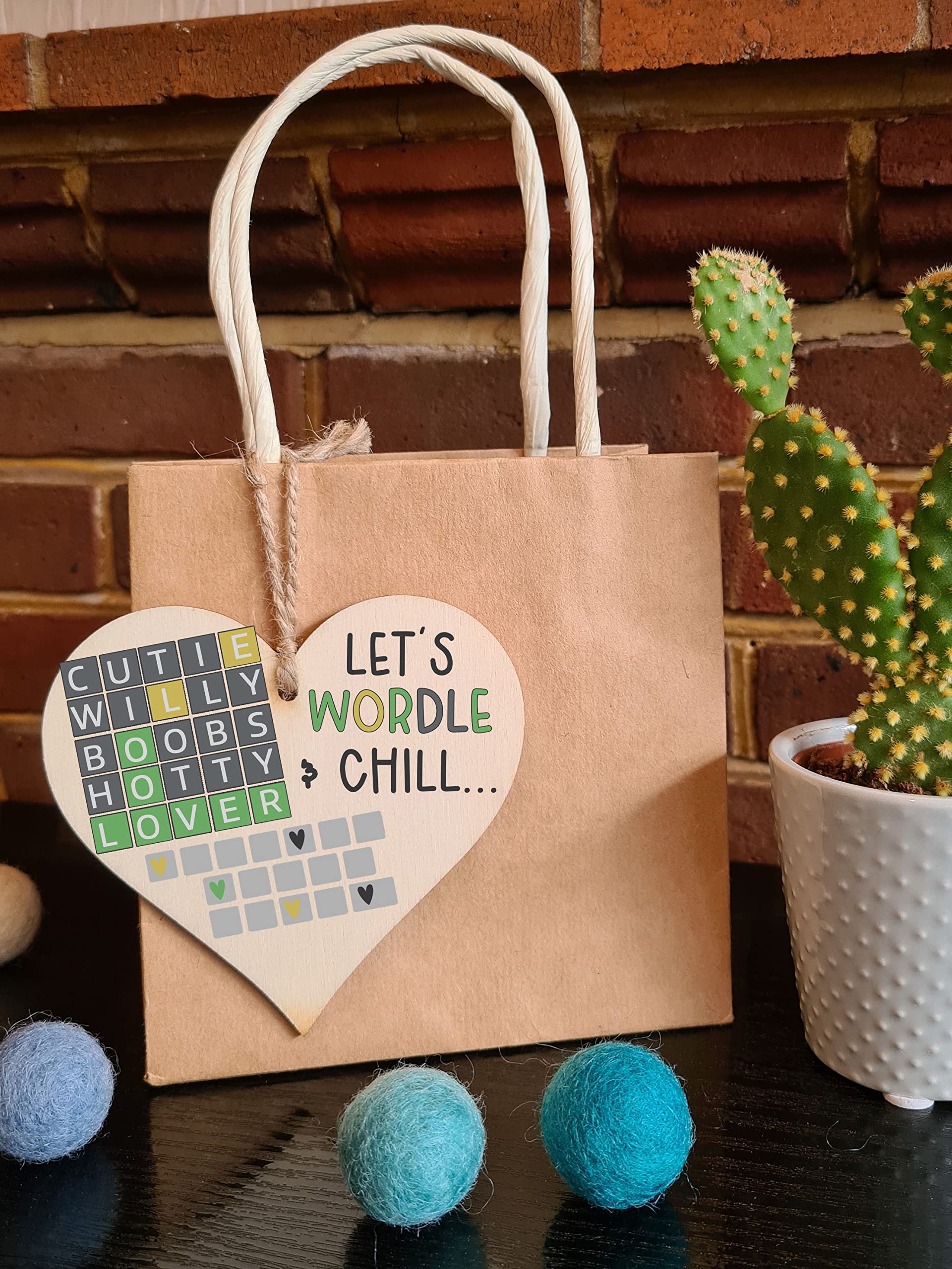 A wooden heart shaped plaque, handmade in the UK from sustainably sourced 3mm poplar wood. Size: 10 x 10 cm. Wording on the plaque: LETS WORDLE & CHILL (CUTIE WILLY BOOBS HOTTY LOVER). This heart shaped plaque is the perfect present for the wordle fan in your life. A great gift, which is a fun, novelty take on the word game craze that has swept the world in recent months and if you haven't played it, then you'll know someone who has. It would be an ideal gift for your other half, with a fun and cheeky message about how much they mean to you. The print is applied directly onto the heart making it extremely vibrant and durable. All design, manufacture and packaging is done by a small team based in the UK. The heart is packaged in a transparent sleeve, and comes with a length of shabby chic twine, making it perfect to give as a gift or as an alternative to a traditional greetings card. Ideal for use as tags on presents and gift bags, or you could hang it around the neck of a bottle.