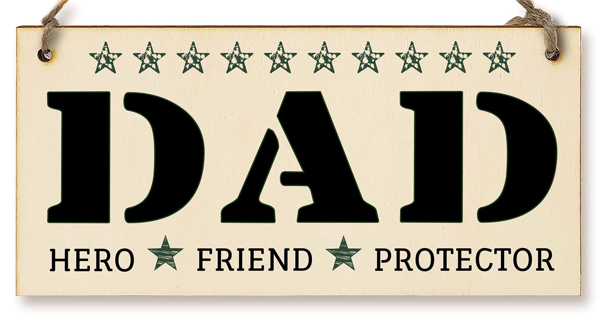 A decorative rectangular wooden hanging wall plaque, which is a stylish and unique way to decorate your home, or to give as a gift to someone special. Wording on the plaque: DAD hero friend protector. Give the gift of laughter with this funny, novelty sign about how amazing Dad is. Can be hung in a man cave, or the shed to remind the best daddy that he has the best kid in the world. The plaque is made from high quality, sustainably sourced 5mm Plywood (PEFC Certified). The image is UV-printed in full colour, directly onto the wooden plaque, to ensure a high quality, bold and durable finish. It is packaged in a transparent sleeve, making it ideal to give as a gift, and comes with a small length of shabby, rustic hessian twine to hang up. This creative piece of wall art will add that little something extra to your space. From the kitchen to the living room, in the bathroom or the study, showcase your personality and hobbies in a fun and whimsical display. If not as a treat for you, then these are perfect to give as a gift to friends, family, neighbours, and colleagues. ***Please note, because these are made from untreated wood, the sign is designed for indoor use and should only be displayed outside for short periods during dry weather. Prolonged exposure to outdoor elements such as rain, water, frost, heat and UVs will damage and fade your sign.***