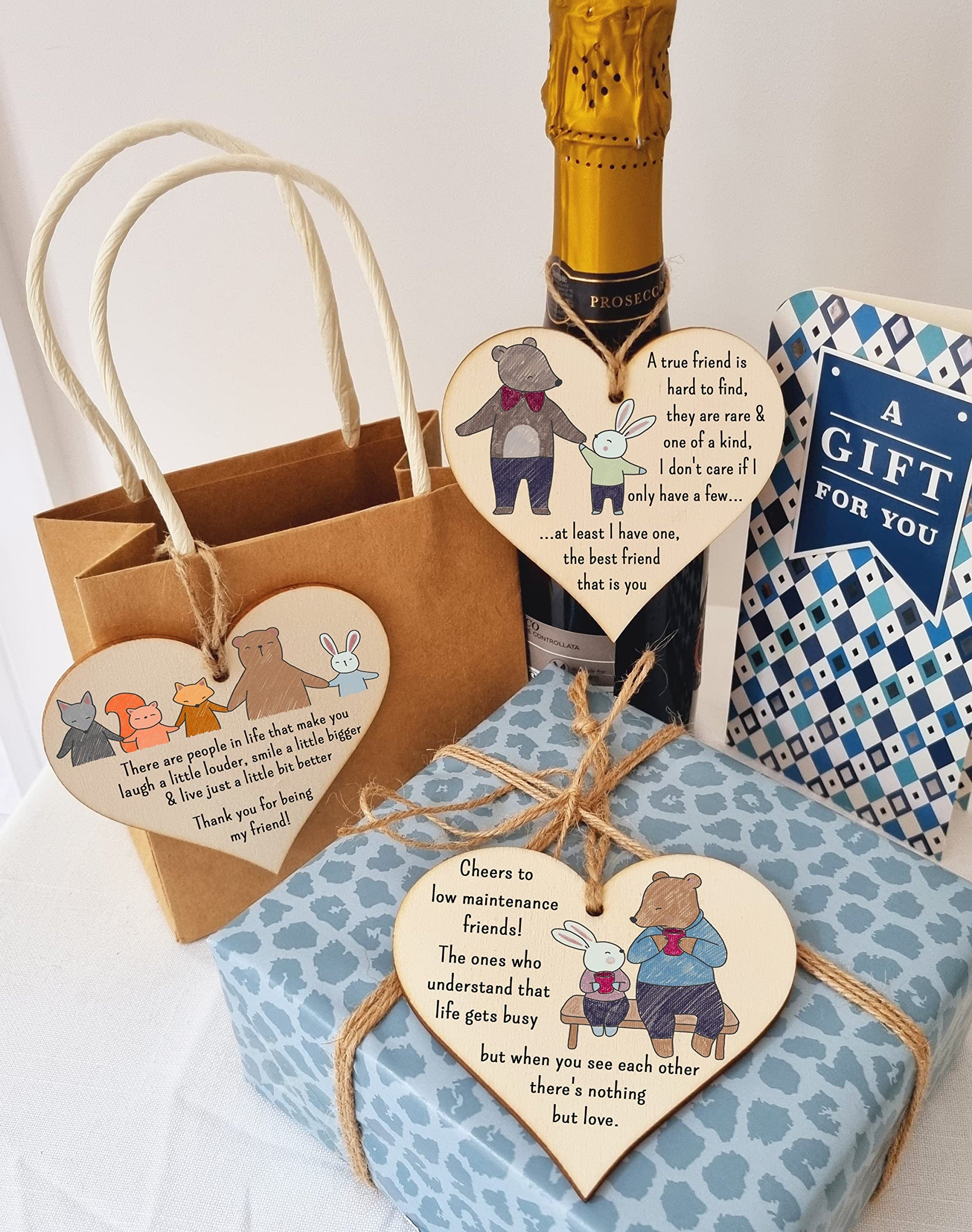 A multipack of x3 hanging wooden heart plaque decorations. This pack contains a set of 3 friendship hearts, perfect for many occasions. Each heart is made from FSC certified 3mm thick plywood, with a hand illustrated design printed directly onto the wood. Each heart measures approx. 10 x10cm, making it the perfect size to give as a small token gift. Ideal as a card alternative, it can be posted directly to the recipient, or these are also perfect around the neck of a bottle or as a gift tag on a present. With a carefully chosen selection of x3 complementary designs, you will have a gift at hand just when you need it. Contents: Plaque 1 - A true friend is hard to find, they are rare & one of a kind, I don't care if I only have a few. at least I have one, the best friend that is you. Plaque 2 - There are people in life that make you laugh a little louder, smile a little bigger, and live just a little bit better. Thank you for being my friend! Plaque 3 - Cheers to low maintenance friends, the ones who understand that life gets busy, but when you see each other there's nothing but love..